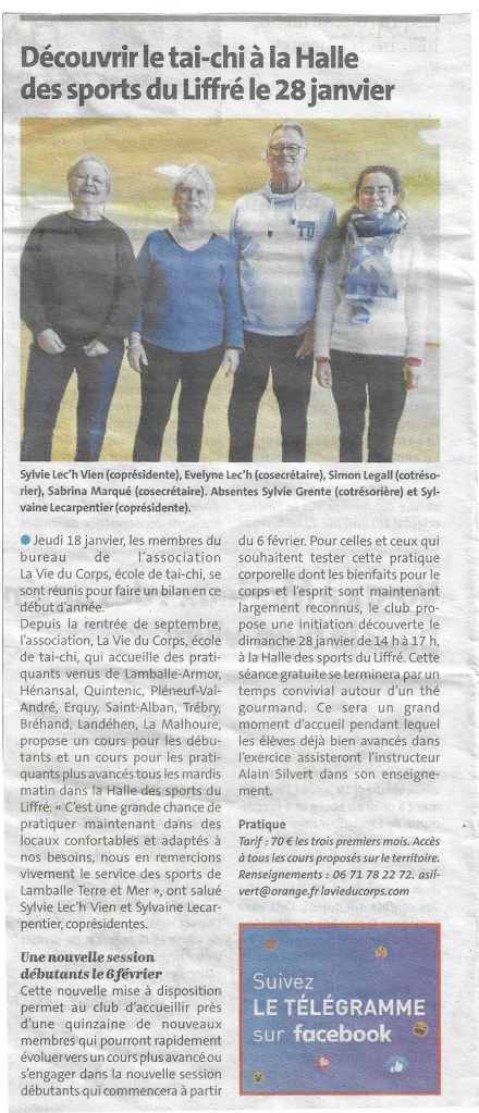Pour celles et ceux qui souhaitaient tester cette pratique corporelle douce et paisible, LaVieduCorps a proposé une initiation/découverte du tai-chi le dimanche 28 janvier de 14 h à 17 h, à la Halle des Sports du Liffré, cette séance était gratuite et se terminait par un temps convivial autour d’un goûter gourmand, vraiment très gourmand.