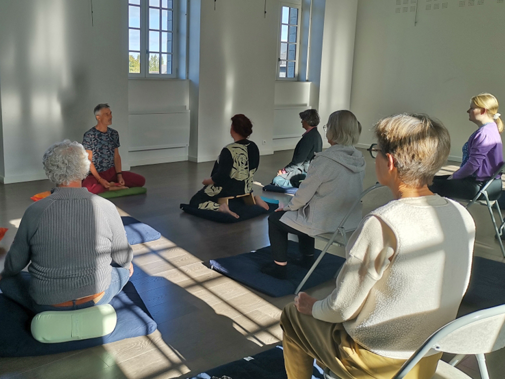 L’association LaVieduCorps, organisait ce dimanche, le 21 septembre dans la salle des Augustins à Lamballe Armor, une initiation à la méditation, un art interne que proposent toutes les traditions authentiques. L’acte de méditer associe l’attention, être pleinement présent, et l’intention, se laisser glisser dans un grand calme. Nous pourrions définir la pratique du tai chi de la même façon. L’assise immobile était précédée d’un travail sur le corps, étirements et assouplissements directement inspirés du qigong. Cette préparation permet des retrouvailles avec son corps, c’est le fondement, la base. Dans la majeure partie du temps de nos journées, nous sommes des têtes pensantes et le corps est notablement oublié, donc c’est pour ça que c’est si important de se retrouver, de retrouver notre corps. Puis en prenant appui sur les sensations et sur la respiration nous nous engageons vers davantage de profondeur, vers la détente, au-delà des agitations et détaché des pensées. La séance était guidée par Alain Silvert, formé il y a maintenant plus de 20 ans auprès d’Arnaud Desjardins. Cette pratique est enseignée au sein de l’association en préparation à la pratique du tai chi.Les participants ont témoigné d’un moment de tranquillité, à la fois ancré dans le corps et ouvert à une conscience de soi tout à fait inhabituelle. Un temps convivial autour d’un thé a permis de clôturer cette matinée et d’échanger autour des expériences de chacun et chacune. Une belle découverte pour tout le monde.